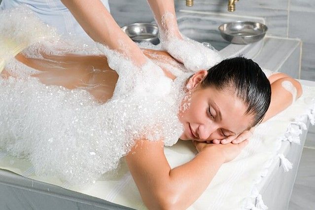 After exfoliation, your body is enveloped in a dense, white cloud of foam made from pure olive oil soap. Performed by master hands, this massage relaxes the muscles and provides a deep sense of tranquility. Relieves muscle tension, reduces stress, and leaves the skin silky smooth.