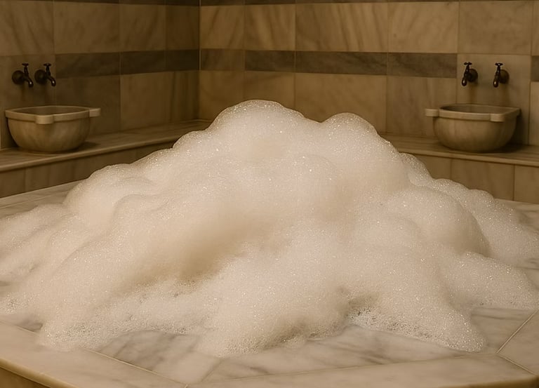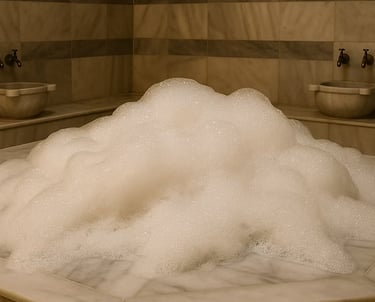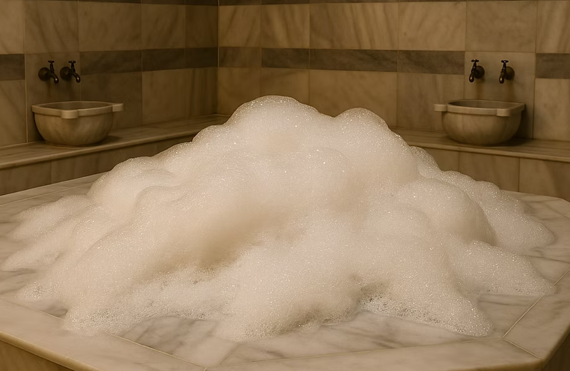 The basic art of the Turkish bath. Experience the invigorating power of traditional scrubbing (exfoliation) and purifying foam massage in the sacred steam. Ritual: Warm up in the sauna and steam room, then relax with scrubbing and foam massage. This stage supports your purification through sweating and prepares you for the scrubbing ritual. A 10-minute invigorating scrub applied by your personal Turkish bath artist deeply cleanses and rejuvenates your skin. The ensuing 15-minute foam massage, with its soothing touches, relaxes your muscles and calms your mind.